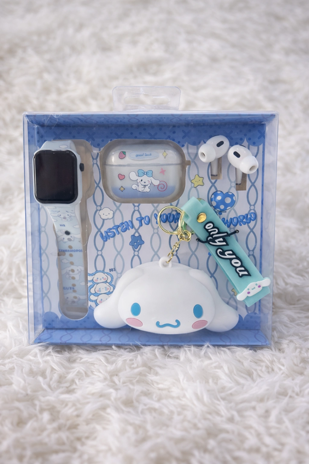 Make gifting extra special with this adorable 3-in-1 Digital Watch, Wireless AirPods & Character Keychain Gift Set, designed to bring style, fun, and everyday usefulness together in one beautiful box. Each set includes a Digital watch, wireless AirPods, and a cute character keychain, making it the perfect surprise for kids, teens, and gift lovers.