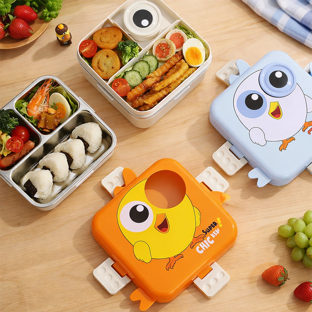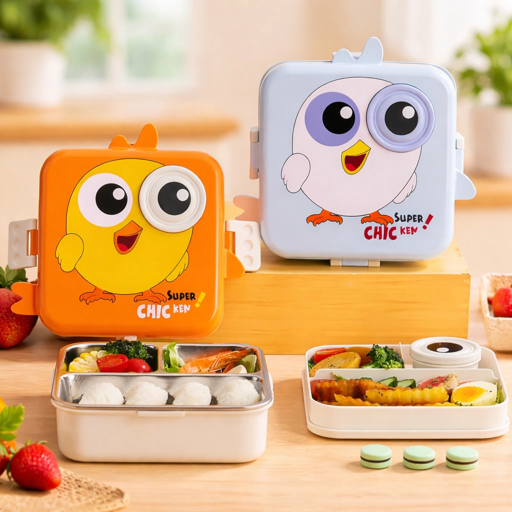 Cute chicken-themed lunch box with 304 stainless steel compartments, leakproof silicone seal and secure locks — perfect for kids’ school meals.