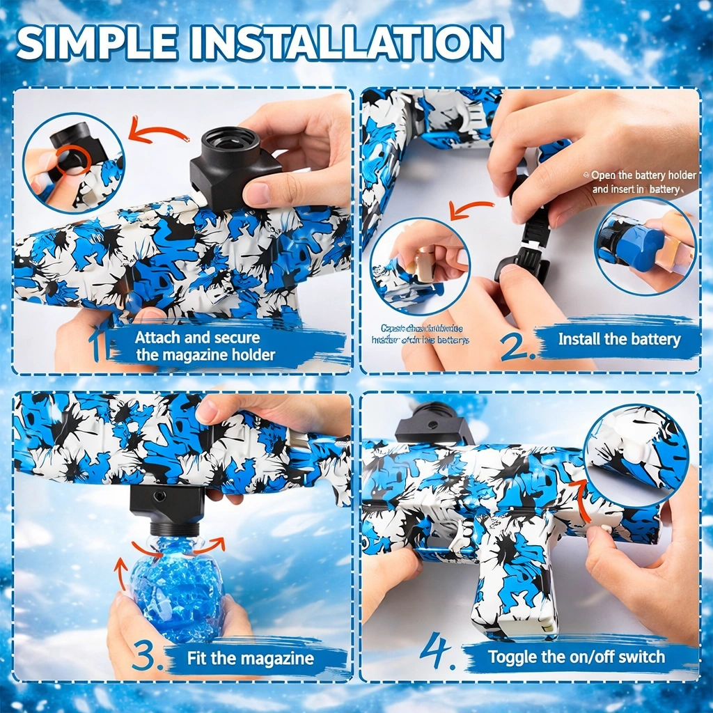 The powerful electric motor allows fast and smooth firing, while the large hopper lets you play longer without refilling again and again. Just soak the gel beads in water, load them into the hopper, and you’re ready for thrilling target shooting and fun battles.