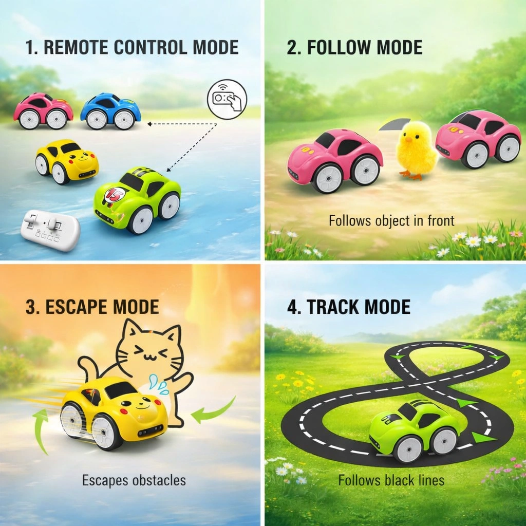 The Follow Me Mini Smart RC Car is an intelligent, interactive toy designed to make playtime smarter, fun, and more engaging. This mini-sized smart car features advanced AI technology with multiple play modes including Remote Control Mode, Follow Mode, Escape Mode, and Track Mode, making it more than just a regular RC car.