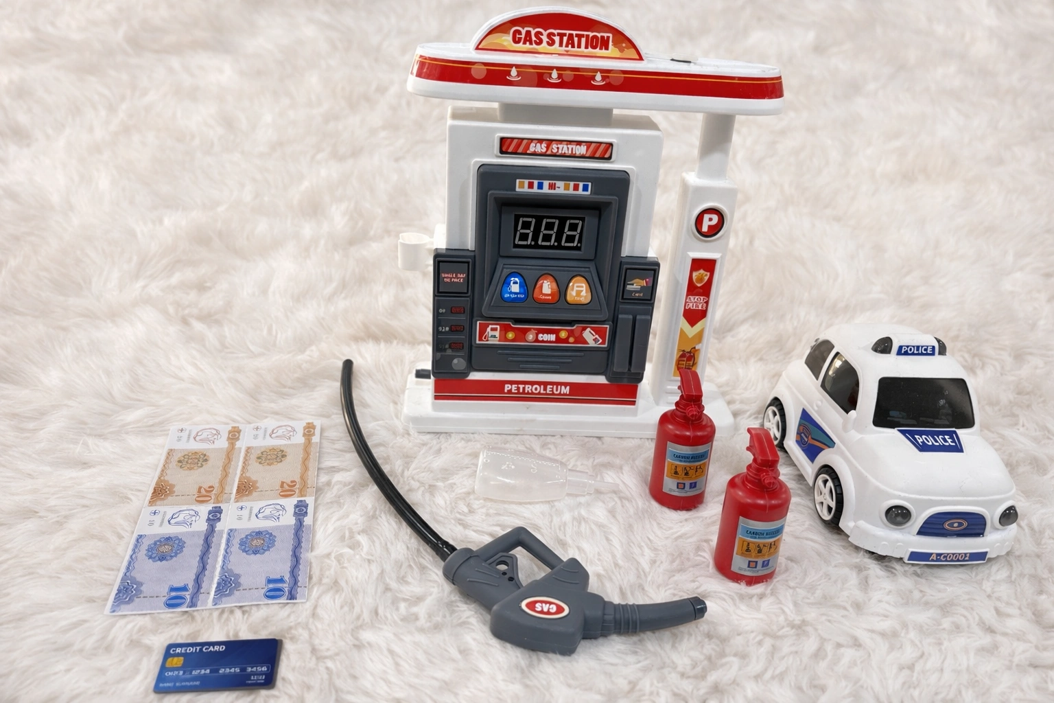 Interactive petrol pump playset with working water flow, digital-style meter and a car with light, music & smoke effects — perfect for fun-filled pretend play.