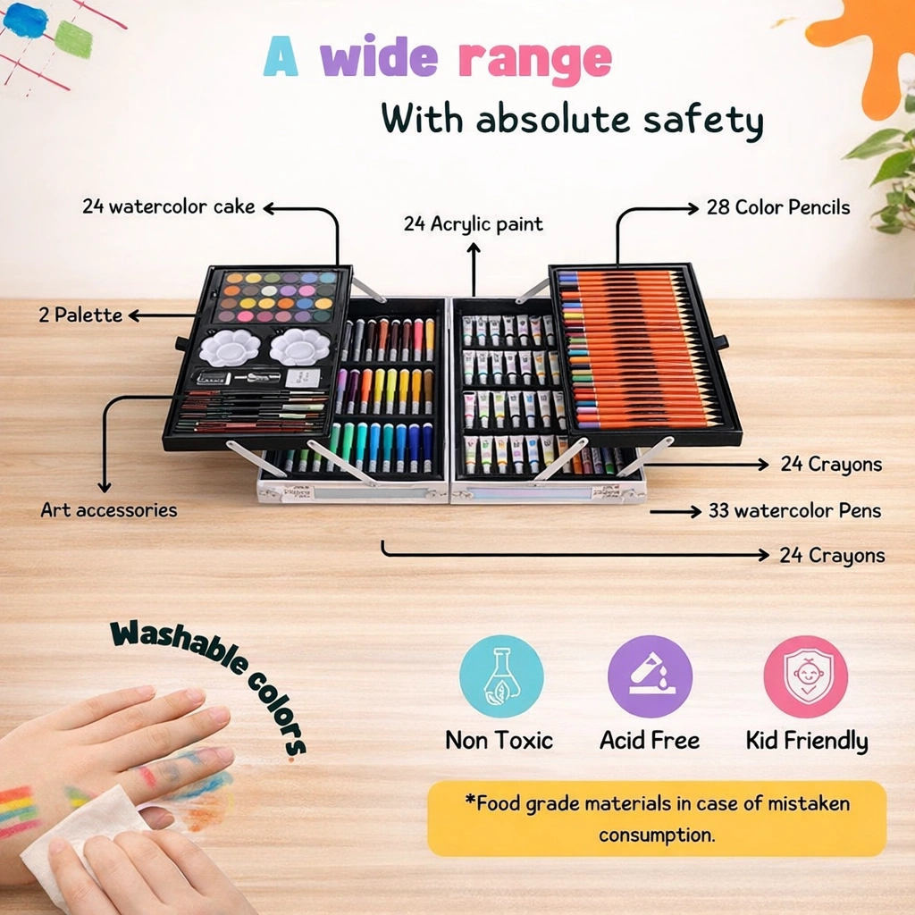 All colours are non-toxic, washable and acid-free, making it completely safe for kids. This art kit is perfect for improving creativity, imagination, drawing skills and hand-eye coordination — while keeping children happily engaged for hours.