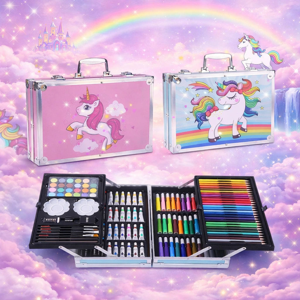 Make every drawing magical with this Unicorn Theme Art Suitcase Set designed specially for kids who love colours, creativity and cute unicorns. This beautiful metal art case comes with a premium unicorn design and opens into a complete professional-style art studio for children.