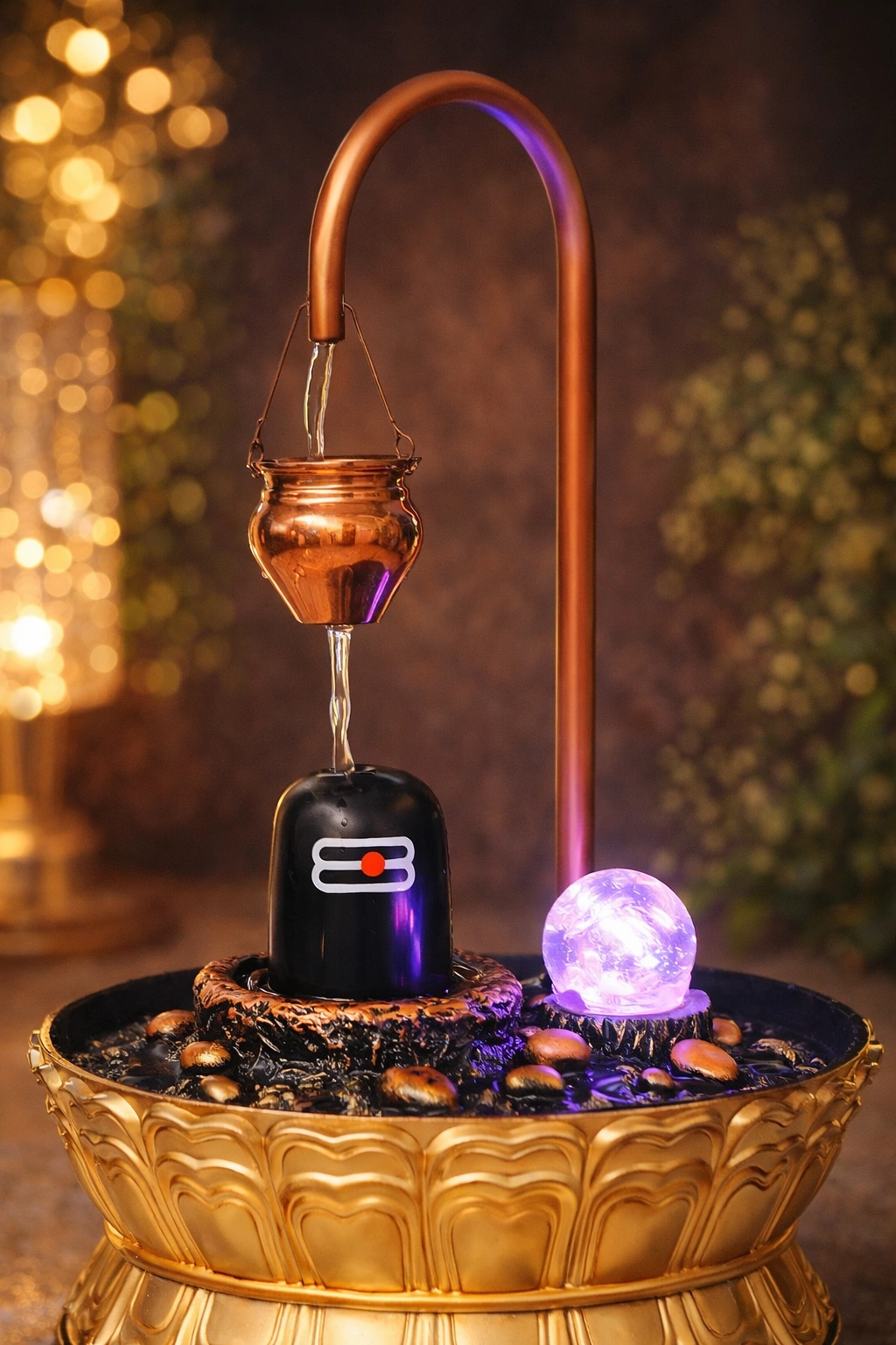 Bring peace, positivity and divine energy into your home with this beautifully crafted LED Shivling Water Fountain. Designed with a sacred Shivling, a curved copper-toned hanging pot and a glowing crystal ball, this fountain creates a calming and spiritual atmosphere wherever it is placed.