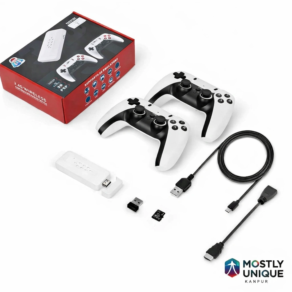 Simply plug it into your TV’s HDMI port, connect the wireless controllers, and start playing instantly — no downloads, no CDs, no internet required.